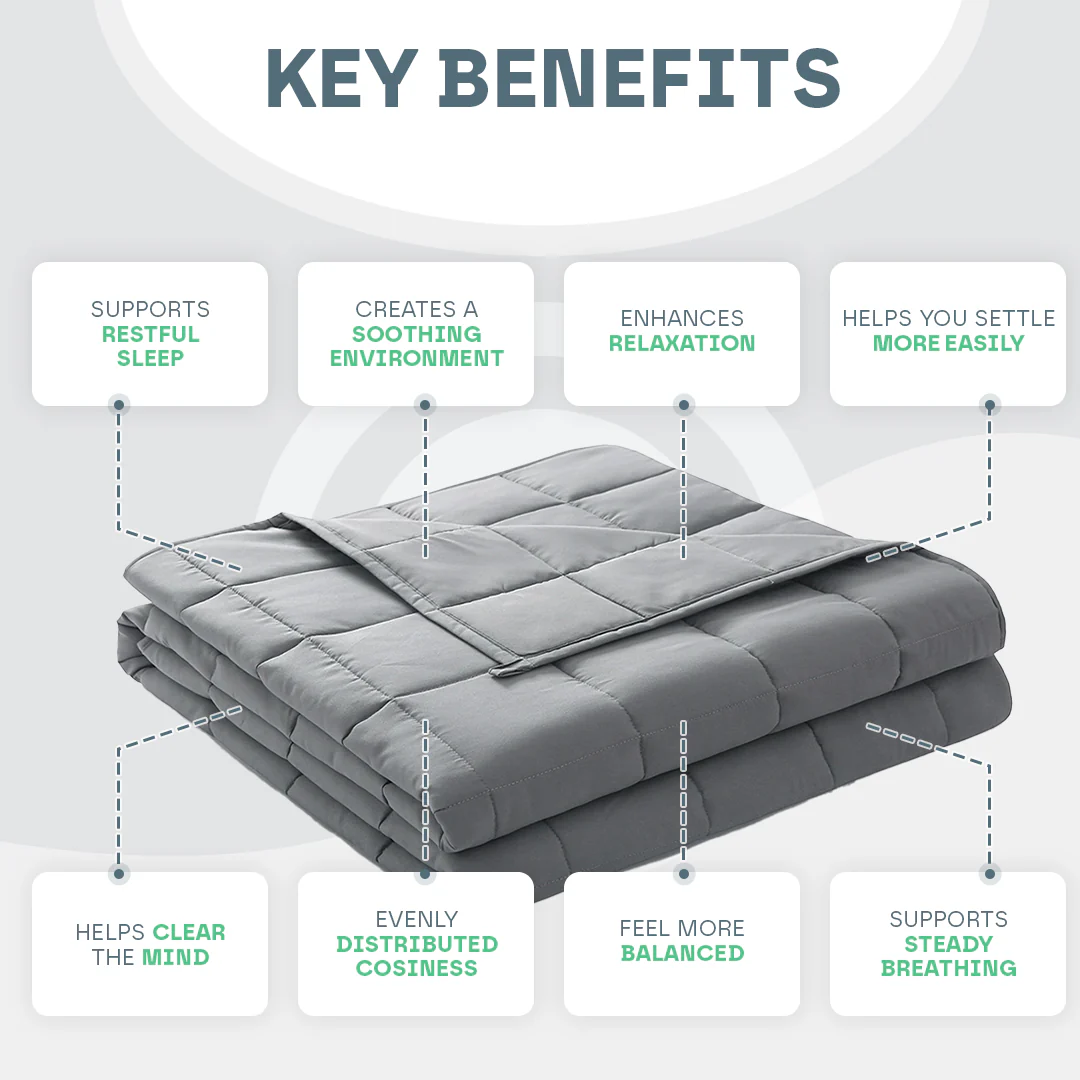 Relax, unwind, and get cosy with our soothing weighted blanket. Silent glass beads mould to your body for a calming, hug-like embrace. Available in 3–7kg for adults & kids.